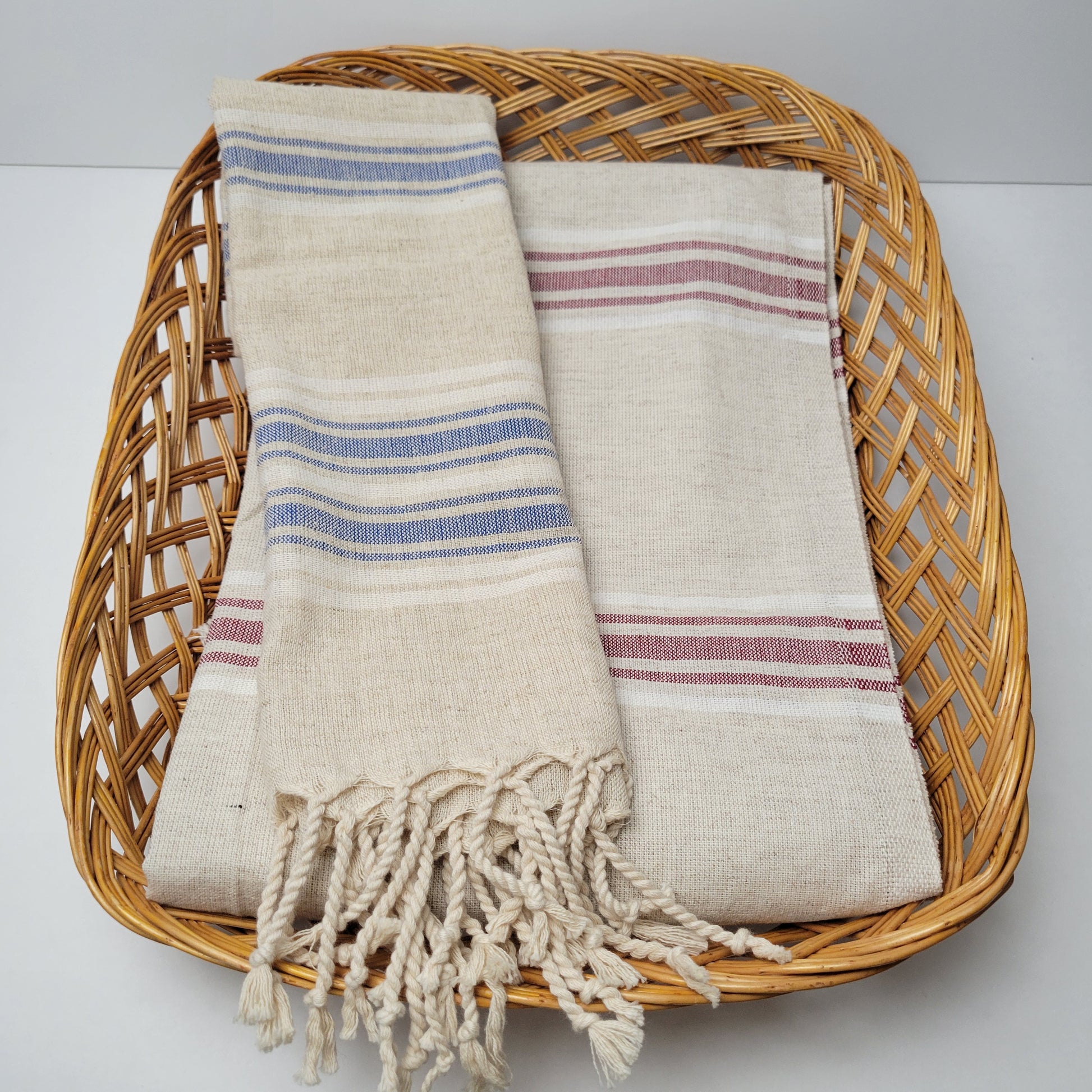 Lightweight towel in a linen/cotton blend. Natural with a traditional blue stripe. Approximately 18" x 40".